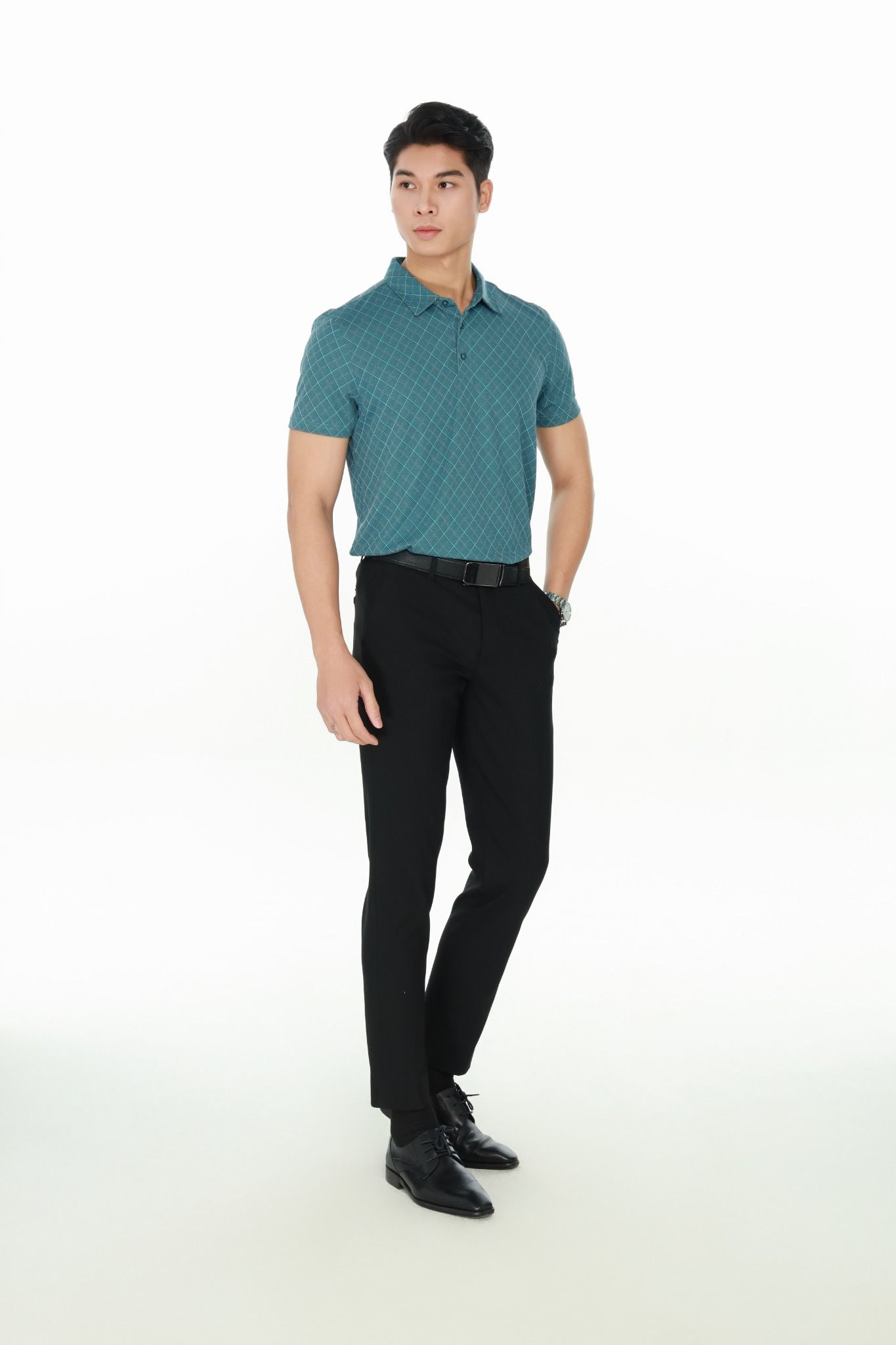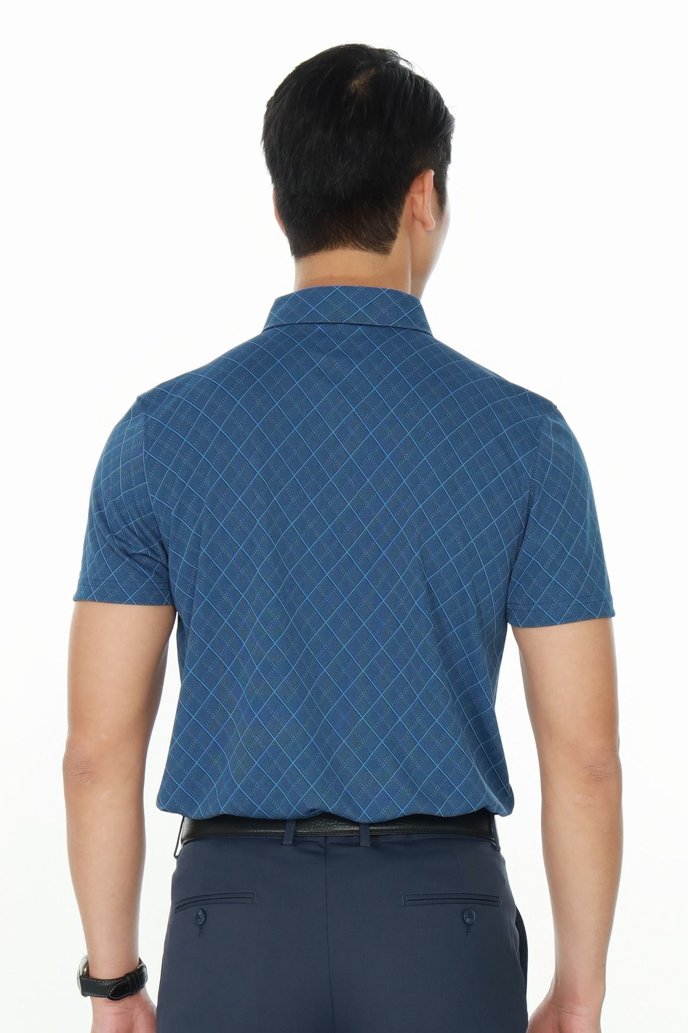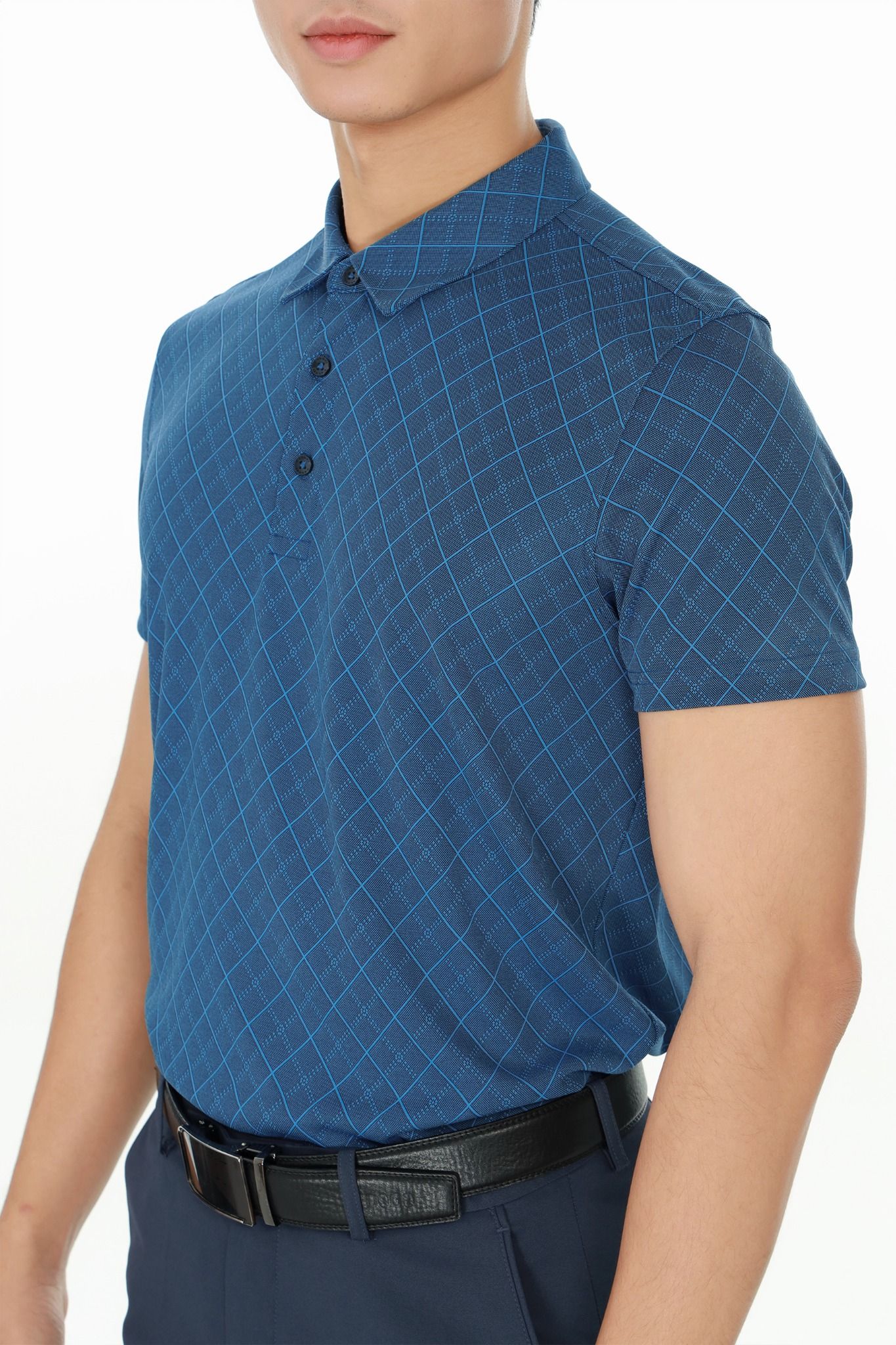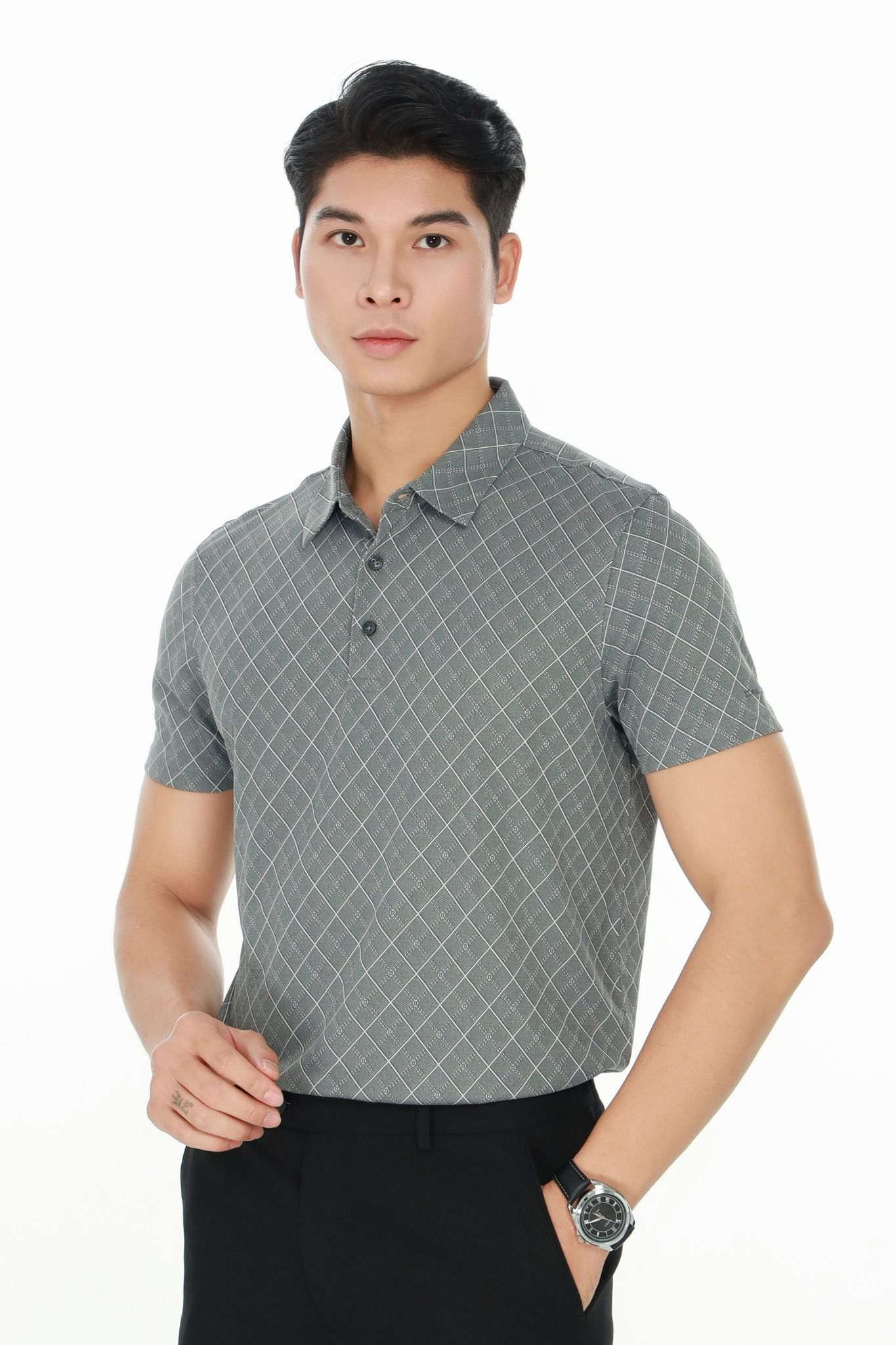 - Áo polo phom suông vừa, cổ đức. Họa tiết kẻ ô chéo trẻ trung, tinh tế